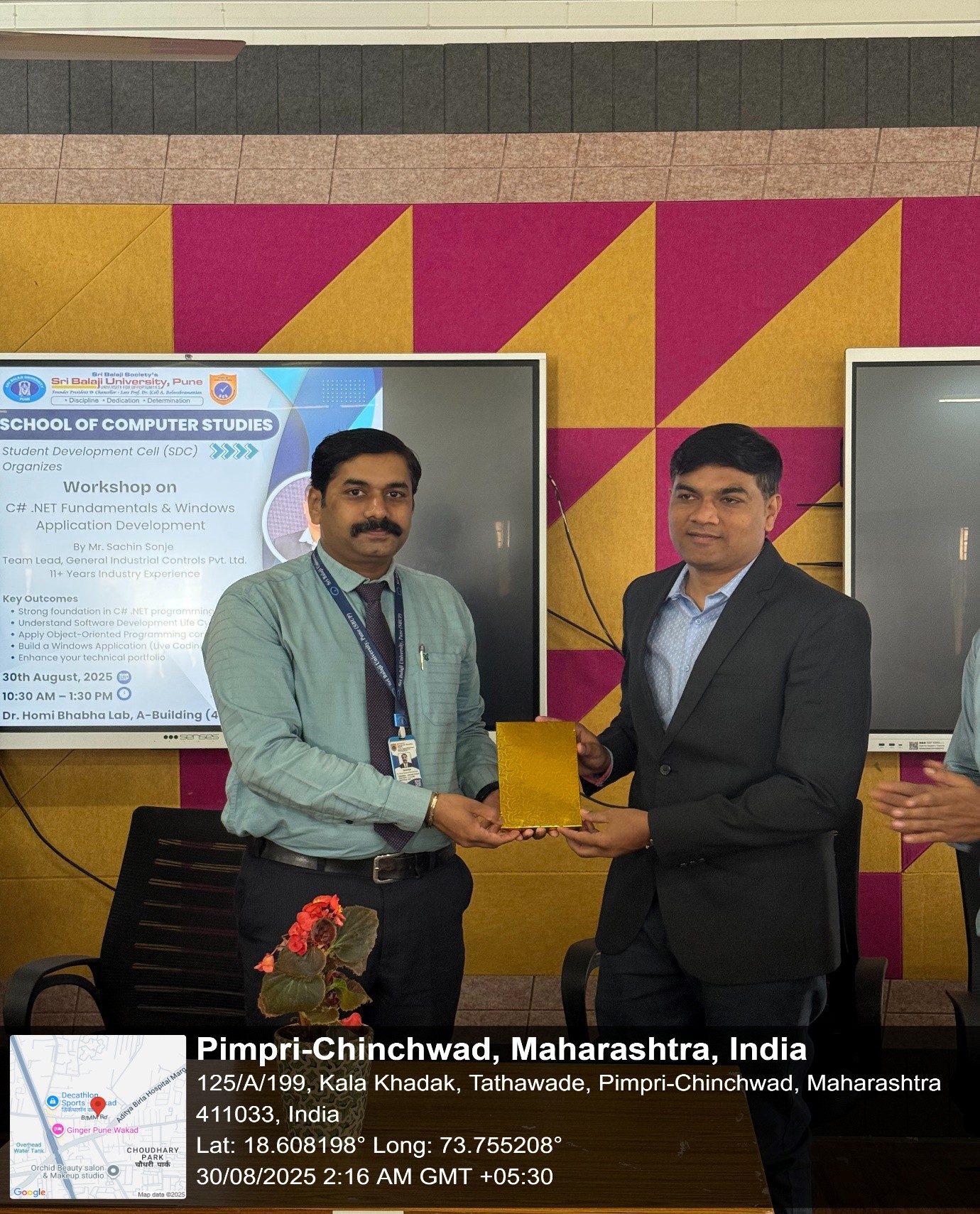 The Student Development Cell (SDC) organized a Hands-on Workshop on C#.NET Fundamentals and Windows Application Development on 30th August 2025, from 10:00 AM to 1:00 PM at SBUP-A-4-L05, conducted in offline mode. The workshop was designed for TYBCA-C and MCA-B students, with 43 participants actively involved. Mr. Sachin Sonje from Tiger Analytics served as the resource person, guiding students through core C#.NET concepts, hands-on coding, GUI design, and database integration. The session strengthened logical thinking, coding efficiency, and industry readiness while bridging academic learning with real-world software development practices.
